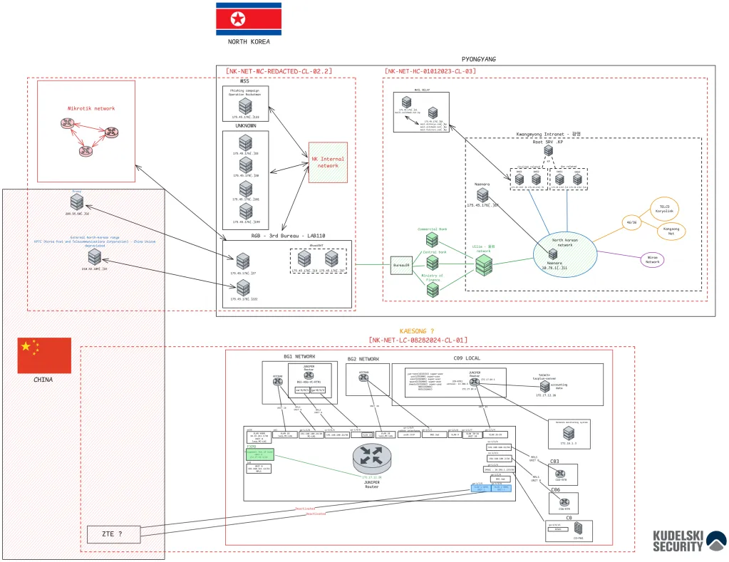 - This part of the network is probably in Kaesong, North Korea. According to the files, the infrastructure is linked to “ZTE”; the links were cut just after their creation, which let us think about the relation to the internet restrictions inside of North Korea.