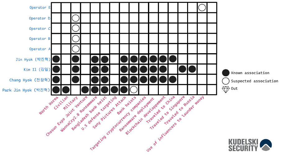 In this particular matrix, the U.S. Department of Justice (DOJ) serves as the sole data source, allowing us to distinguish between civilian and military operations conducted by known members of the Lazarus Group. Additionally, analyzing travel patterns can reveal key insights, such as identifying countries that may serve as proxy residences for operatives conducting cyber-attacks against their intended targets.