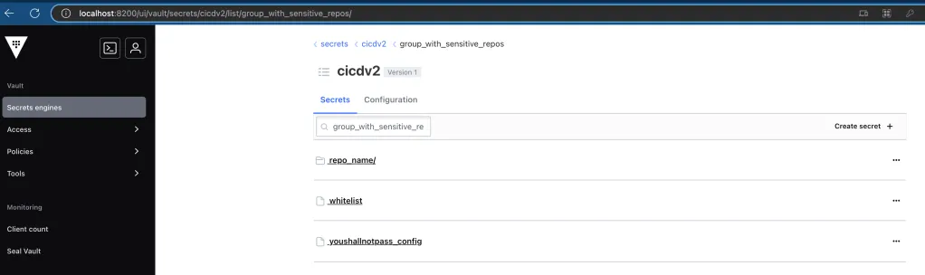 However, on Vault, we have only whitelisted a specific repo (repo_name) in that namespace (while the two other entries are the configuration files at the namespace level):