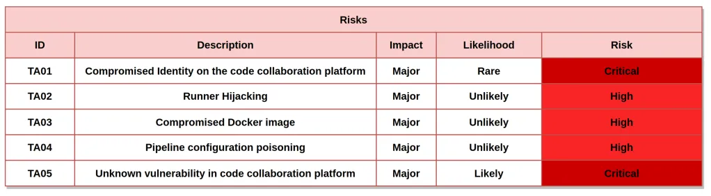 - Compromised identity: A threat actor gaining access to the code collaboration platform, to modify its configuration to execute code on the secure environment.